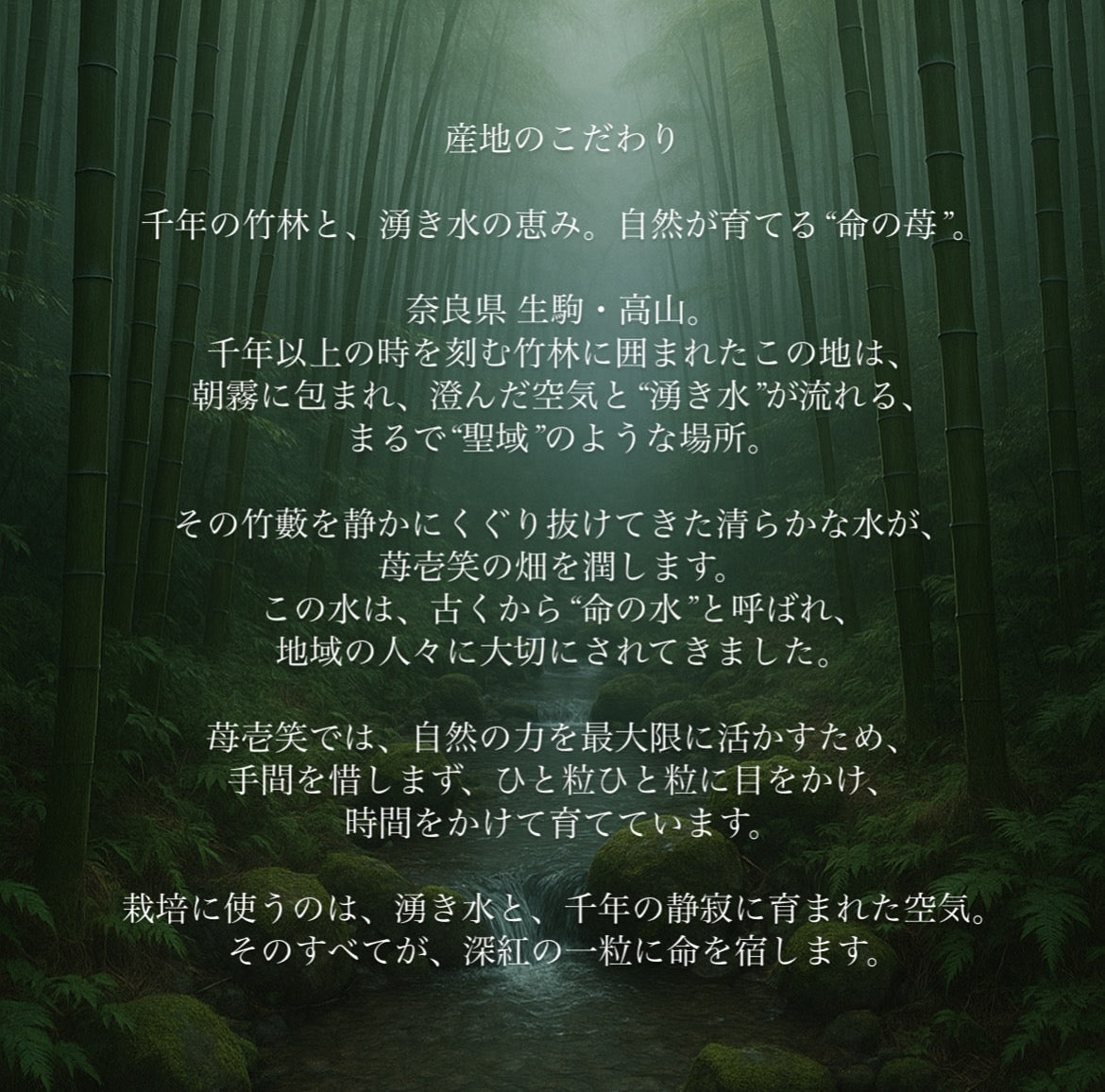 千年の竹林と湧き水に抱かれた“聖域”で育まれた、苺壱笑の古都華(ことか)。
